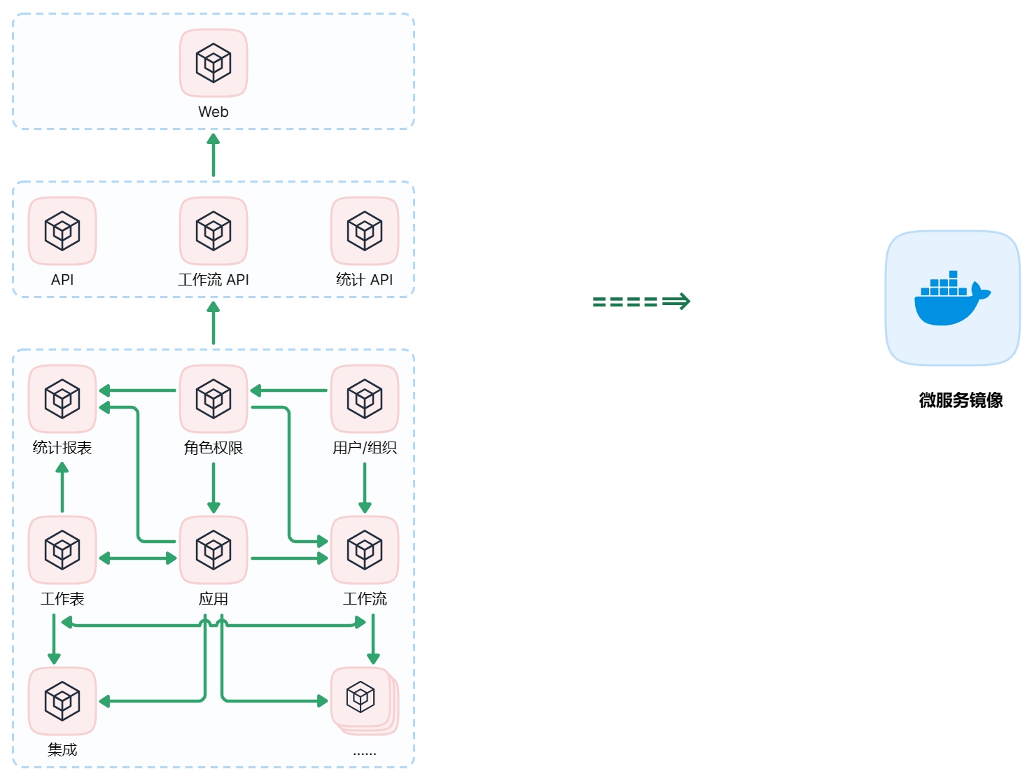 HAP 整体基于微服务架构,采用 Docker 镜像进行部署。私有部署模式下,为了确保系统稳定性的同时又能降低部署难度,我们针对这种较复杂的微服务依赖关系进行了改造,最终采用基于微服务架构的单镜像模式,将各个独立的微服务镜像合并成一个大镜像(微服务应用镜像),配置文件内置并支持扩展。同时也提供了数据存储组件镜像(含:MySQL、MongoDB、Redis、Elasticsearch、Kafka、MinIO),单机部署模式下默认启用。另外还采用基于 MinIO 的文件对象存储和基于 OnlyOffice 的在线文档预览,最终实现一个命令启动 HAP 服务。