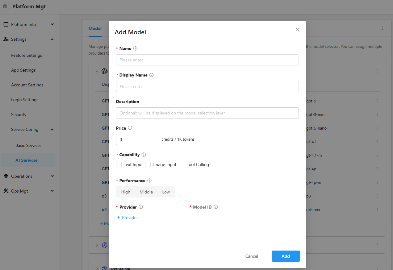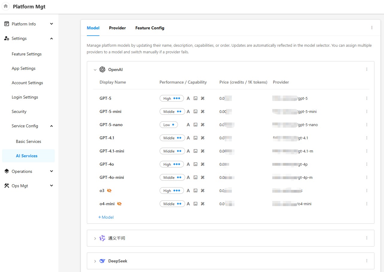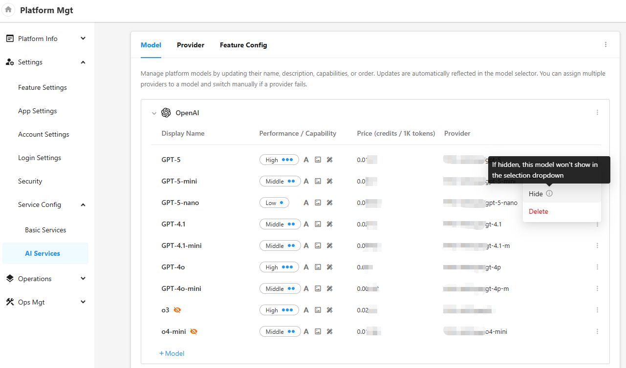 Support hiding developers and models on the use side. After hiding is set, the developer or model cannot be selected on the user side (i.e. the model selection layer of workflow AIGC related nodes), but the function configuration of Platform Mgt is still optional.