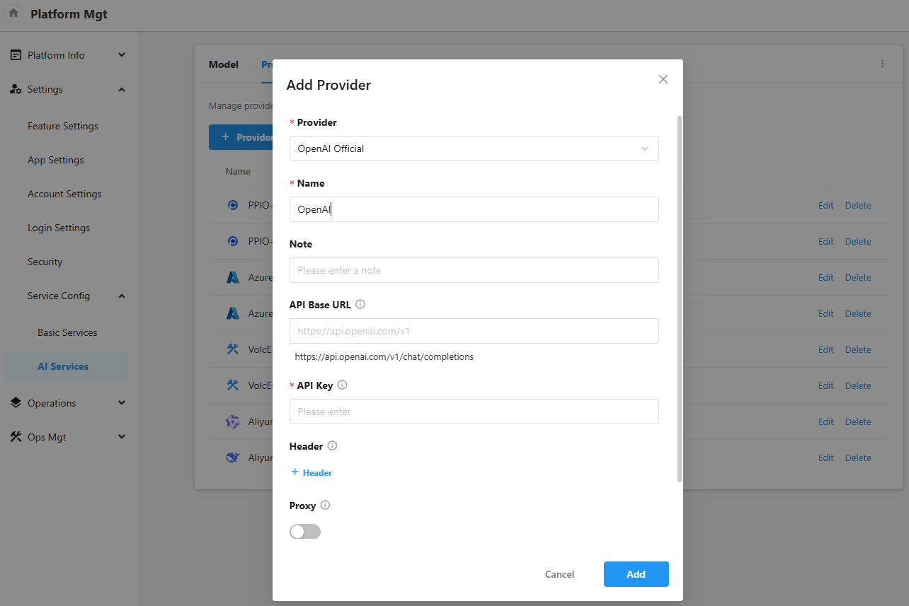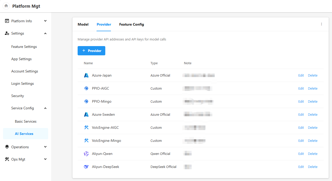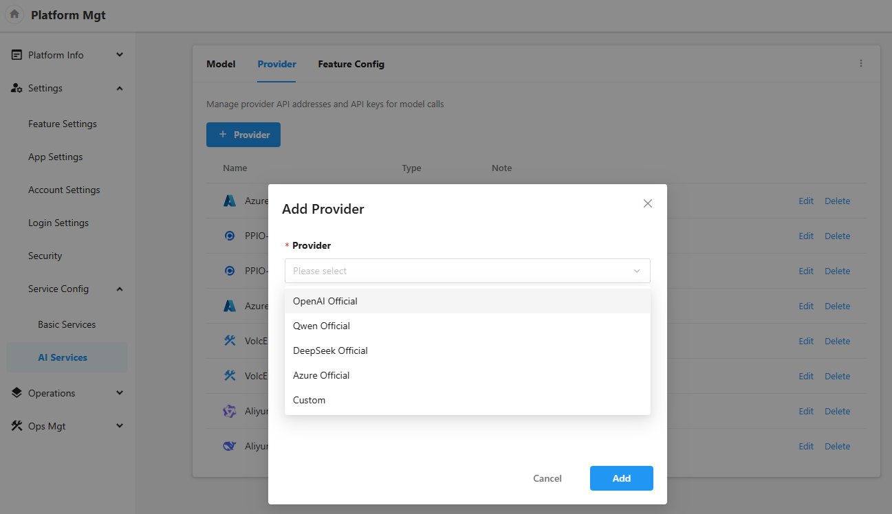 OpenAI,Qwen,DeepSeek) by default, and the administrator can use them after completing the provider configuration (preset developers cannot be added repeatedly).