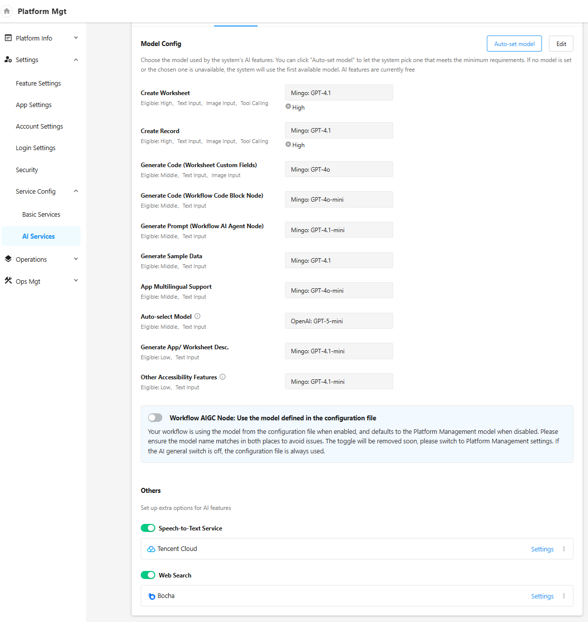 Others: support the configuration of Speech-to-Text Service (used in Mingo), Web Search (used in AI creation record)