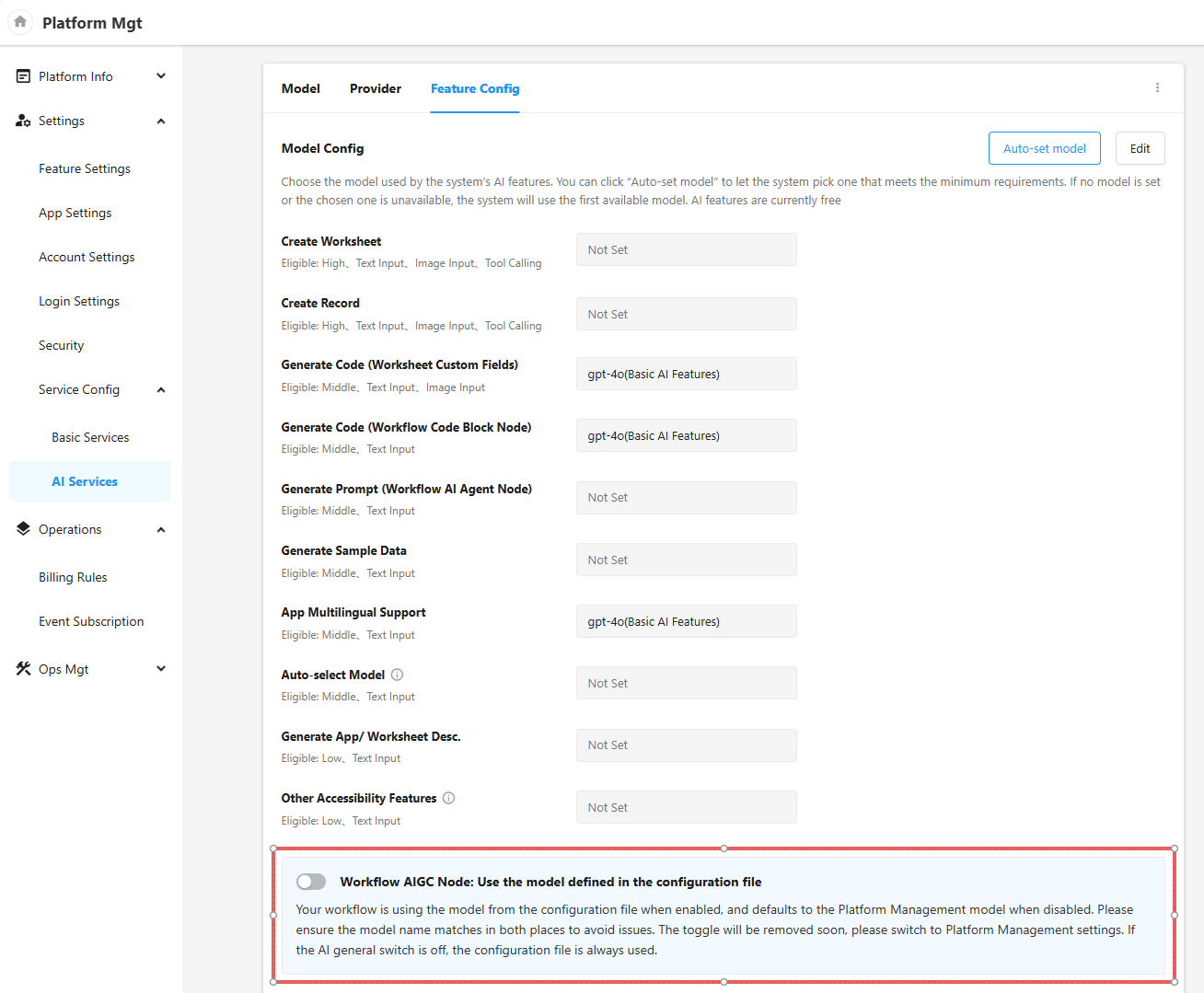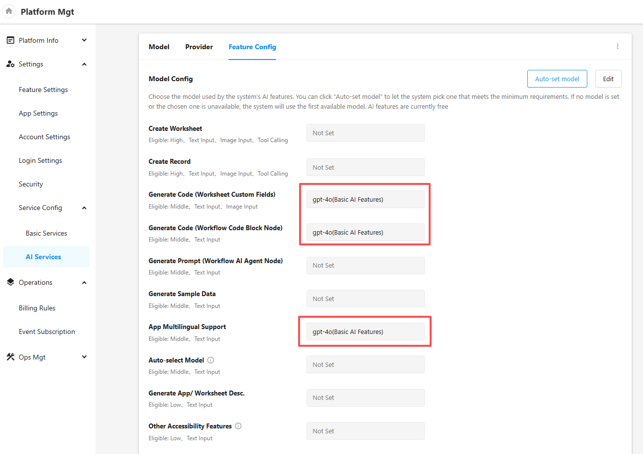 If you have previously configured a model in AI Service - Basic AI Function, the model in the original configuration will still be used by default for the three functions of worksheet custom fields, workflow code block automatic generation, and application of multilingual intelligent translation (as shown below)