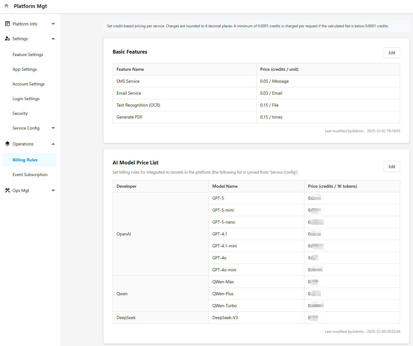 If it is currently a platform version, you can set the unit price of third-party services for tenants in Platform Mgt - Operations - Billing Rules.