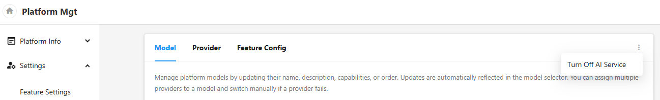After closing, use the side to hide all AI related function entries. The AIGC nodes and dialog robots that have been added in the application will also fail when calling the model.