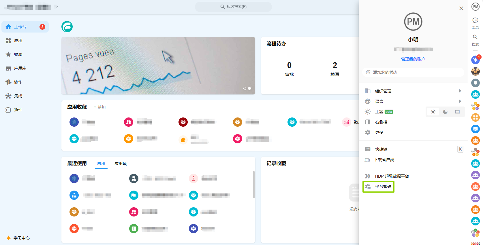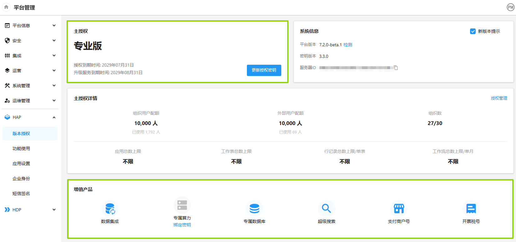 FAQs使用问题更新授权密钥本页总览更新授权密钥 点击头像显示菜单列表,然后进入平台管理(仅平台管理员可见) HAP 平台管理 => HAP => 版本授权 授权密钥分 主密钥 和 增值产品密钥,注意绑定入口 HDP 平台管理 => HDP => 版本授权